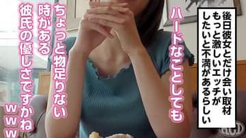 【企画説明】世間には、AV顔負けの変態プレイをプライベートで実践している猛者(カップル)がいるらしい…一体どれほどディープな関係を彼らは築いているのだろうか…その真実を追い求める実践型ドキュメンタリーバラエティー!!舞台はとあるホテル街。事が終わりホテルから出てきたカップルにインタビュー。するとこれが年齢差13歳の年の差カップルでした。初めは居酒屋の店長とバイトという関係だったのが、年上好きな彼女からアタックし交際することになった2人。亜麻色のショートヘアにキュートな顔つき。そしてスレンダーで靭やかなボディラインがイヤらしい!顔もカラダもスタイルも抜群な上に、彼氏のお願いでブラ丸見えなすっけすけTシャツを着てしまう…この従順ぶり!こりゃたまらんわい!!ちなみに今日は、磔やSMプレイといったハードな刺激を求めてホテルを利用したらしい。さらに詳しい話を聞くため、2人の自宅へお邪魔すると、拘束器具や調●モノのエロ本(2次元)のオンパレード!そして見せられる、首輪をつけた彼女がディルドに跨り腰を振るオナニー映像。これは相当なマゾですわ!彼女www聞けば、彼女がマゾ気質な性癖に目覚めたのはこの2次元本がキッカケであり、今でも愛読するほどのバイブルらしい。そして後日。とあるカフェへ呼び出された我々は、彼女からこんな悩みを打ち明けられる「彼は好きだけど刺激が足りない…息を付く間もないほど激しく●されたい!!」型位の良い男に激しいピストンで子宮を突かれたり、喉奥まで男根をぶっこまれたり、まさにあの調●モノの2次元本の如く、ハードなプレイを味わいたいとのことだった!なので、AV界屈指のマッチョ男優を用意し、ハードなプレイを存分に楽しんでもらうというのが今回のキーポイント。根本まで深く咥えさせられる男根に、小さいお口からだらしなく涎を垂らし、とめどなく溢れるマン汁を撒き散らしながら、イッてもイッても終わらない追撃ピストンの嵐に恍惚な表情で●いしれる!この根っからのマゾ女子は、ハードプレイの連続で一体どうなってしまうのか!?