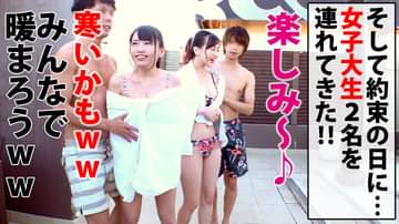 類は友を呼ぶ!?美女美少女同士を同時にナンパ!!2人組だからガードも甘い!?その隙を狙って各個撃破と行こうじゃないですか!!今回は温泉同好会サークルに属するJD2人組をナンパ!!本当に温泉でHなコトをするわけには行かないので…特別ステージをご用意いたしましたwwそこで存分にイチャコラしてもらいましょうか!!今回は“こんな後輩JDいれば大学生活バラ色だろう部門No.1”ぶっちぎりで美少女がターゲット!!もうカワイイ爆裂カワイイ!!しかも、カラダは何とも言えないドエロイえちえちBODY!!リアクションもかわいい!!しかも意外とHにもノリ気!?先輩がフェラすれば迷わず負けずとパクリッ♪これは我慢してた説が急浮上!!じゃあ…そりゃね♪ってコトで二人っきりで部屋でイチャコラ始めますかい!!
