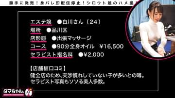 【身バレ即配信停止】―――――《この作品はエステが好き過ぎてエステ嬢と結婚するも、エステ狂いが原因で離婚した●撮好き汁男優のエステ●撮ドキュメントである。》―――――※本作品は4K高画質で録画されております。そのため一般的な●撮作品よりも高画質での収録となっておりますが、お客さまの再生環境により、画質は異なります。ご了承下さいませ。―――――【今回のメンエス嬢】・白川さん 24歳 →ハメ撮り&中出しOK!顔も◎ ・本番交渉難易度:ノリ良し◎・感度:バッチリ◎ →ハメ潮スプラッシュ!【料金】品川区発・某出張マッサージ店(健全店)・90分全身オイルマッサージ →¥16,500 ・セラピスト指名料 →¥2,000―――――#白川さん #24歳 #出張マッサージ嬢#中出し! #イキまくり #ド敏感 #スプラッシュ潮吹き #逆マッサージ #電マ責め絶頂 #●撮 #ハメ撮り #6カメ #90分オイルマッサージコース#品川区発某店 #健全店 #本番―――――素人ハメ撮りクルー『だまちゃん。』による超グレーな完全個人撮影モノ!!!※無許可素人作品につき取り下げ可能性がある作品になります。