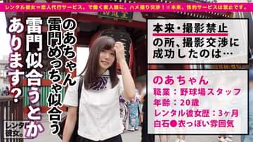 【巷で話題のレンタル彼女=恋人代行サービス。で働くアイドル級美少女<素人娘>に、ハメ撮り交渉!】※本来、性的サービスは禁止です。本日のお相手は…スラッとしていてスタイルが良い爽やか系女子!のあちゃんです。●●に着替えて貰うと「懐かしい?」と満更でもない様子ww浅草をブラブラ散策して射的したり人力車を楽しんだりと本当のカップルの様にデートを楽しみました。人通りが少ない道でベンチに座りイチャイチャしているとどことなく良い雰囲気になってきたのでぐいぐい攻めてみるとのあちゃんもノリノリになってきました♪ホテルに移動して一息ついたところでイチャイチャを再開!服の上から優しく胸を揉みながらそういう雰囲気まで持っていき…最終的に猫耳のエッチな衣装でお風呂に入ってもらうところまで成功wwそのままち○ぽをしゃぶって貰うと、丁寧にご奉仕してくれるのあちゃん。部屋に戻ってイチャイチャしつつ、のあちゃんのおま○こを指でかき混ぜたり乳首を舐めたりと攻めてみると体をビクビク震わせて感じている。正常位で挿入してゆっくり腰を振ると、突き上げるたびに良い反応をしてくれるのあちゃん。騎乗位では自らも激しく腰を振り、息を乱しながらビクビク跳ねてイッてしまったww気持ちいいセックスもして大満足の表情でホテルを後にしたのあちゃんでした♪