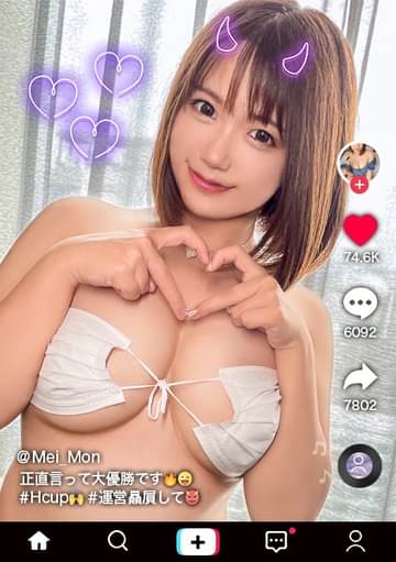 T☆kTokでエッチな動画を投稿するエロ可愛い女にDM(ダイレクトメッセージ)で連絡を取り、その場のノリでしれ~っとSEXまでしちゃおうという、次世代ナンパ企画!(1)都内某所、予定より早く来てしまったので彼女の勤務先のメンズエステサロンに内緒で潜入!そこで今回のT☆kT●kerHカップの爆乳が魅力の「メイ」ちゃん(26歳)を発見!しばらく様子見しているとなんと彼女、お客さんのパンツを脱がし、いやらしい手つきで手コキを初めてしまった!エッチなマッサージをマジマジと覗き見していると彼女に見つかってしまいマッサージは中断お仕事中なので今は駄目ですとちょっと怒られてしまった(2) しばらく経ったあと彼女と別場所で合流、話を聞くため近くのカフェに行くことに(3) T☆kT●kにエロい動画アップするようになってからDMが100件以上来るようになったという彼女、その中でタイプの男と見つけてはヤリまくっているというエロイことが大好きなメイちゃん。そんな彼女からゆっくりできる所に行きたいとお誘いが…早速ホテルへと移動(4)やる気満々の彼女に誘われセックス開始! Hカップのおっぱいは勿論!お尻、太もも、カラダ全身柔らかい!チ○ポを全て包み込むパイズリはまさにマ○コの上位互換!おマ○コを完全に広げながらデカ○ンをおねだりする彼女にお望みどおりデカチンを挿入!!激しいピストンで突きまくると歓喜の声を上げながら喘ぎだす!本気を出した彼女の腰振りテクにイかされ膣奥に大量のザーメンを放出!男がイった後も間髪入れずにもう一回始めようとしてすぐに2回戦突入!繰り返される快感に絶頂が止まらない!!何度イッテもどん欲に快感を求めるメイちゃん!合計3回もイケされた男はもうヘトヘト新たに助っ人を呼ぶことになった。(5)場所をベッドに移し、助っ人のイケメン君をスタンバイ。彼女より年下ということで今度はお姉さんモードになるメイちゃん。隠語で誘惑しながらフェラからオイルパイズリと極上ご奉仕で責め立てる!このままだとイッテしまうのでおマ○コに挿入してSEX開始!爆乳を揺らして痙攣絶頂を繰り返す騎乗位ファック!!ベロチュウしながら互いを激しく求め合う超濃厚SEX!最終的に合計5回も射精させてしまったメイちゃんは令和史上最強の絶倫女だ!!