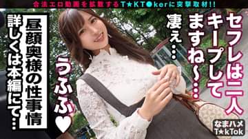 T☆kTokでエッチな動画を投稿するエロ可愛い女にDM(ダイレクトメッセージ)で連絡を取り、その場のノリでしれ~っとSEXまでしちゃおうという、次世代ナンパ企画!(1)新宿のオフィスビル前で待ち合わせた今回のT☆kT●ker「ココ」さん(30歳)と合流!人妻さんなのに私服はかなり過激的で透け衣服からみえる純白ブラがなんともエロい(2)風のうわさでエッチな事をすると知っていたようで今回も「子作り動画の撮影に来ました」と驚愕の一言!これは話が早いので早速別場所に移動することに (3)エロトークに花を咲かせながらもこちらもヤリたい衝動が抑えられず彼女の身体を抱き寄せ人妻ボディを味わう、30歳とは思えない美麗な身体を優しく責めると敏感に身体を震わせる!そして抱き付きながら濃密ベロチューで乱れまくるココさん!純白パンティの中のおマ○コは既にグッショリ濡れ濡れ!卑猥な表情でチ●ポを頬張り、ジュポジュポと卑猥な音でバキュームフェラ!今度は電マ&極太バイブで魅せつけオナニーまでする淫乱っぷり!もう我慢できんと下のお口へ生挿入!男に跨り腰を激しく振りながら、強烈な快感に全身を震わせるココさん!床にひれ伏しながら激しく突かれイキまくる!そのまま所構わずハメ続けて中出し連発!(4)卑猥な宴はまだまだ続き、オイルを使いリンパマッサージから卑猥な手コキでチ○ポを強○勃起!自らの身体にもオイルをかけて全身ヌルヌルオイルSEX開始!汗だく汁だくオイルだくで激しく突きまくるハードピストン!!合計3発も出した後「凄い気持ちよかったからまた呼んでもいいですか?」と今日だけじゃまだまだヤリ足りないココさんでした♪