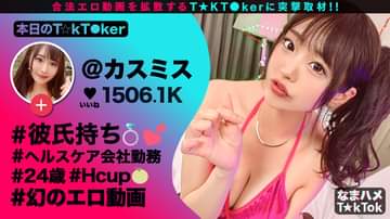 T☆kTokでエッチな動画を投稿するエロ可愛い女にDM(ダイレクトメッセージ)で連絡を取り、その場のノリでしれ~っとSEXまでしちゃおうという、次世代ナンパ企画!(1) 事前にスタッフが連絡を取り新宿区西新宿で待ち合わせた、今回のT☆kT●kerは「カスミ」ちゃん(24歳)!T☆ktok動画が人気のカスミさん。育毛剤、健康食品、サプリメントを開発・販売する仕事に勤めるOLさん。ちょっと前に、ネットに一瞬だけアップされ、バズった幻のエロ動画で話題になった人。 (2)近くのカフェに移動して彼女の実態調査。なんと彼女はT☆ktokだけじゃなく、色んなエロ動画を撮影するのが好き。彼氏持ちなのに会社同僚・上司との浮気経が多数。上司宅の玄関や会社のトイレで同僚と撮ったフェラ動画がも 撮影しちゃう淫乱ぶり!今日もヤル気満々の彼女とホテルへ行こう彼女からお誘いが!早速ホテルへ移動することに! (3) ホテルへ着くと早速コートのボタンを外し、抱き合いながら濃密ベロチュウ、美尻を揉みしだきながら堪能したあと見るからに美味しそう爆乳をいただく!チンポを差し出し彼女お得意のM字開脚フェラチオ。パンツを剥ぎ取り濡れ濡れマ○コを舐めまくる!お互いに我慢ができなるなり生のまま挿入!男に跨り快楽貪る杭打ち騎乗位!くびれたカラダが仰け反るくらいにバックで激しく突きまくりたっぷり中出し!お風呂に移動した後もずっと絡み合いセックスが止まらない!あまりの気持ちよさに我慢ができずに2発目の中出し発射!(4)モザイク必須のエロ衣装に身を包んだ彼女と3回戦突入!トロけ顔でチンポの快感にハマっていきます。バックから激しく突き上げ連続絶頂!正常位でガッチリと奥に届かせる乳揺れピストンで子宮を刺激!最後は溜まっていた精子を膣奥に全てぶちまけ発射。下品なくらいドスケベな変態婦女カスミちゃんでした♪