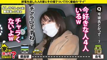 プレイ内容:【シーン①】:服越しに乳チラ見、服越しに乳揉み、(絆創膏外して)乳首弄り、キス(ピクニックキス・バードキス)、彼女が乳首責め、亀頭舐め、ノーハンドフェラ、バキュームフェラ、竿舐め、玉舐め、手コキ、乳コキ、ザーメン舐め取り。【シーン②】:AV見ながらオナニー、服越しに局部責め、AV男優登場・全身フェザータッチ、乳首舐め、服の上からポルチオ刺激、キス(ピクニックキス・バードキス)、ノーハンドフェラ、抱き合いながらキス(2回目)、手マン、四つん這いにさせてアナル舐め、バックで挿入、立ちバック、手マン&潮吹き、対面立位、首●め立ちバック、立ちバック(2回目)、手マン&潮吹き(2回目)、立ちバック(3回目)、背面座位、正常位、側位で顔射、片足上げ側位、手マン&潮吹き(3回目)、正常位(2回目)、スパイダー騎乗位、対面騎乗位(時雨茶臼・反り観音)、対面座位、バック(2回目)で顔射(2回目)、寝バック、後側位で顔射。あらすじ:終電を逃した女性に「タクシー代を支払うので家に行ってイイですか?」という某番組のフリをし、声をかけ家まで行ってやっちゃおうという企画です。