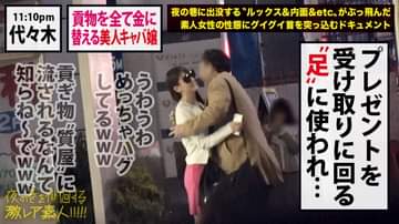 ○テーマ:夜の巷に出没するルックス&内面&etcがぶっ飛んだ素人女性の性態にグイグイ首を突っ込むドキュメンタリー○①クリスマスの時期に新宿をうろついていると道端で座り込んで飲み会をしていたりムササビの着ぐるみをしていたりヒッチハイクしていたりと無法地帯!こんなに色んな人がいるなら激レアさんもいるだろうと期待を込めて街中を歩きます。そこで出会ったのはホノカさん。ブランドのショップバックを何個も持って歩いているので声を掛けてみると今からお客さんから貰ったプレゼントを質屋に売りに行くというので着いて行きました。無事換金してご機嫌のホノカさんに密着で取材をお願いするとお客さんの家にプレゼントを貰いに何件か周るのでタクシー代払ってくれたら良いですよ♪との事だったので車を出して取材続行です。②次々と男からプレゼントを貰いそれを速攻で売りに行くホノカさんww一息ついたので呑みに行ってゆっくり話を伺います。経験人数が200人を超えると言う彼女、3人でホテル行きますか?とノリで言ってみると簡単にOKしてくれました。③ホテルで話をしながらおっぱいを触っても全然嫌がらないのでもっと大胆に触れて服を脱がすと気持ちよさそうに体を捻るホノカさん。スタッフのち○ぽを美味しそうに咥え、腰をゆらゆら揺らす姿がなんとも色っぽく魅力的です。④豊満なGカップでパイズリして貰えばあまりの気持ちよさについ出してしまい申し訳ないので男優にホテルまできて貰いセックス再開です。⑤目隠しをして刺激を与えたり電マを渡してオナニーをして貰いとろとろになってきたところで男優とバトンタッチしてさらに強い刺激を与えるとビシャビシャと潮を吹いてイってしまいました。後ろから挿入してピストンすれば脚をガクガク震わせて気持ちよさそうに喘ぎ、目をとろんとさせてセックスに夢中になってる様子のホノカさん。突き上げる度にぶるんぶるんと大きく揺れるおっぱいは絶景です。何度も膣奥目掛けてピストンし、カを堪能しながらフィニッシュ。激しいセックスが気に入ったらしくもう一回とお誘いをしてくるホノカさんでした♪
