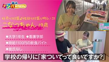 #19歳 #大学一年生 #看護学部 #Fcup #乳首イキ #奉仕の女神夜の街中で声をかけたのはクリクリお目々の「こなつちゃん」。夜でも遠くからでもどの角度から見ても可愛いレヴェル。常に笑顔の彼女に心のつながり感じる…。そして身体も…。看護師を目指してる? 夜勤でこんな看護師がやってきたら…。妄想を抑えて「10代美女限定の100万円チャレンジ企画」と伝えると、「チャレンジしたい。参加料で10万? じゃあ全然。おうちに来ていいとも~」とノリがいいので、お邪魔しました~。クローゼット覗いたら意外とセクシーな攻めるファッションで妄想が膨らむ(笑)。「看護師を目指すのは人の役に立ちたくて」「昔から憧れてて」「彼氏がいたときも課題を手伝ってあげたり」と根っからの奉仕精神に期待大。そこで、若いときに女性にひどい振られかたをした、ここにいる彼の女性恐怖症を直してあげるために、射精させたら100万円と、企画を説明すると、「彼、陽気そうなのに。無理してるの(笑)」とセクシーな下着姿に。こんな可愛い顔してるのにエロランジェリーにエロエロボディ! 肌の質感がしっとりしてエッチい。「私の舐め方おかしくないですか?」と全身リップ。「上手ですぅ」とクンニにも抜群の反応。立ちバイブで膣内も感度抜群。「いっぱい触って。膣の感触思いだして。指遣いいいよぉ♡」とたっぷり手マン。Fcupパイズリもフェラも満面の笑顔が可愛いすぎる。「恥ずかしい」と言いつつデカチンにノリノリ! 騎乗位もノリノリ! 超早漏まんこに何度イッてもガン無視決め込んで金玉がからっぽになるまで高速ピストン!バイブで。バックで。もうダメダメ。敏感なおっぱいを同時に攻めたら乳首イキ! JDのキツい肉襞マンマンに前立腺がバグりまくって、めっちゃ射精の連続中出し沼!「助けられたらよかった。ベッドがぐちょぐちょ。新しいの買わなきゃ(笑)」と100万円ゲットで欲望の笑顔!