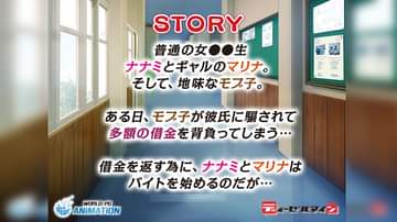 同人サークル「ディーゼルマイン」のPCゲーム、「女●●生ナナミ・マリナ ~エッチなバイト性活~」がモーションアニメ化!!タイプの違うナナミとマリナを操作して、お金を稼ごう!健全? 不健全!? なアルバイトで友達の借金返済を手助け!!アルバイトは危険(セクハラ)が一杯!?借金返済の果てに2人(+1)を待つ運命は…娼婦かそれとも!?清楚系J●とギャル系J●のエッチなお金稼ぎ!・服屋でバイト中、試着室でマリナが男性客に…?!・マッサージ店のバイトで店長に騙されたナナミが、手コキ+睾丸マッサージを覚えさせられる?!・フィットネスクラブで店長とのエッチな個人レッスン!・ガールズバーで働くマリナ・VR体験でゲームと現実でエッチな目に遭うナナミなどなど……普通(だけど巨乳)の女●●生ナナミとギャルのマリナ、そして、なぜか一人だけ彼氏のいる地味なモブ子。不思議と仲良しの3人組だったが、モブ子が彼氏に騙されて多額の借金を背負ってしまう。それでもまだ彼氏を想うモブ子を正気に戻すため、そして、借金を返す為に、ナナミとマリナはバイトを始める……。2人は無事にお金を集められるのか、それともHなバイトに手を染めてしてしまうのか!?