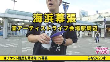 今回の企画はイベント会場に出没するチケット難民(当日現地でチケットを入手しようと会場に来る人達)をターゲットにお目当てのチケットをエサにインタビュー撮影を了承してもらい別場所へ移動、チケットを譲ることを条件に普通のお願いからエッチなお願い、果てはセックスまでお願いしてしまおうとする企画♪今回スタッフが訪れたのは千葉県のイベント会場、当日行われるのは大規模なロックフェスのようで会場に到着してすぐにチケット難民の捕獲に成功!!今回捕獲したのはみなみちゃん(23)アパレル店員だという彼女の服装は一見するとオシャレな今どきギャルなのだがよく見ると胸元は大きく開き、キワッキワのショーパンで男を悩殺!!「見られることに抵抗はない!!」と言う彼女.抜群のプロポーションにハリのある肌が惜しげもなく露わになって堪りません!!さっそくインタビュー開始!![みなみちゃんの恋愛観][エロい失敗談][ファッションチェック]と話しは進みライブ会場にいる痴●についての話題へ、なんと痴●を自分から誘い込むと言いだしたみなみちゃん!!どのように誘うのか実際にやってもらう事に、男の手を取りみなみちゃん自らお尻、オッパイへと誘導、めちゃくちゃ触らせてくれました♪色々楽しめたので終了しようとするとみなみちゃんは続ける気まんまん♪形勢逆転で相手を責めだすみなみちゃん!乳首舐め→フェラ玉舐め→パイズリと相手を責めるテクも凄い!!相手のデカチ○が気に入ったのか「入れたい♪」とおねだりをするみなみちゃん。ソファ→洗面所→シャワールーム→ベッドと場所変えながらデカチ○の強烈ピストンでイキまくり!!ドンドン呂律が回らなくなってフラフラに「ライブ行けな~い」と言う彼女にスタッフからもうやめるかと提案すると「やめな~い」とまだまだイキたい様子♪思う存分イカせてあげ最後はお顔にめがけて顔射!!「ライブより楽しいこと見つけちゃった」と白く汚れた顔のままで呟くみなみちゃんでした。
