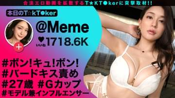 プレイ内容:【1】バードキス、ディープキス、乳揉み、乳しゃぶり、手マン、クンニ、顔面騎乗、ディープキス、乳首舐め、フェラ、パイズリ、玉舐め、クンニ、挿入、正常位、バック、立ちバック、背面座位、バック、中出し。【2】洗面所に移動、ディープキス手コキ、乳首舐め手コキ、フェラ、挿入、立ちバック、対面座位、騎乗位、中出し。【3】コスチューム変更、耳舐め、ディープキス手コキ、乳首舐め、太ももコキ、シックスナイン、顔面騎乗、電マオナニー、挿入、騎乗位、正常位、バック、寝バック、測位、電マ正常位、中出し、お掃除フェラ。あらすじ:T☆kTokでエッチな動画を投稿するエロ可愛い女にDM(ダイレクトメッセージ)で連絡を取り、その場のノリでしれ~っとSEXまでしちゃおうという、次世代ナンパ企画!!今回のT☆kT●kerは大人の色気がハンパない!巨乳スレンダー美女Memeちゃん(27歳)!表参道でブイログを撮影中の彼女にコラボ撮影をお願いした所、、、快くOKしてくれたMemeちゃん。オシャレなカフェで彼女の私生活からエッチなことまで根掘り、葉掘り聞いた所でホテル移動!バードキスが好きだという彼女とチュッチュッチュとなんども唇を重ねていると…完全にその気なったMemeちゃん♪♪噓偽りなきGカップの天然オッパイを揉みしだき!しゃぶりつく!びしょ濡れになった彼女の桃色マ●コに生挿入…その後はエロくて生々しいセックスをたっぷり堪能!オール中出し3連発!