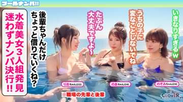 【プールで遊ぶ水着女子たちをガチナンパ→ハメハメしちゃう企画。】プール施設で水着美女を捜索♪早速ステキな女グループを大発見しました!『のあちゃん、のぞみちゃん、りおちゃん』の3人組は、女の子達だけでプールを楽しみに来たみたいです。ザ・ギャルって感じののあちゃん、のぞみちゃんに対して、りおちゃんは何だか控え目…?押しに弱そうな雰囲気を感じ、ワンチャン狙って部屋へお持ち帰りっ!緊張を解すため雑談をすると、なんとりおちゃん……こう見えてめっちゃ肉食系でした!!気に入った男は逆ナンして捕まえたり、100本近くのチ●ポを喰らってきたりと、相当なヤリマンエピソードを持っててビックリですwwこりゃあ食わねば勿体ない♪って事で、酒をのませレッツパーリィ!魅惑のG巨乳も白く艶めかしい美体もぜーんぶ味わって、お礼に大量中出ししてあげました!!【プール×ナンパ】りおちゃん B:87 W:59 H:91※この作品は成人にコスプレをさせています。※この作品の出演者は全て19歳以上の成人です。(All performers in this work are adults over the age of 19.)