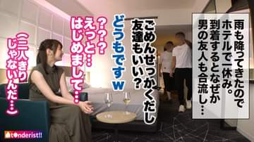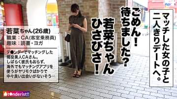 Tin●erでマッチングした女の子とどうにかこうにかSEXしちゃおうという新時代SNSナンパ企画!今回マッチした女の子は、現役美人CAの若菜ちゃん(26)超ハイスペ女子な彼女ですが意外にもしばらく彼氏ナシ。海外でもマッチングアプリを使うがヤリモクばかりで中々良い出会いがないそう…。そして性欲もかなり溜まってそうですね…。そんな大玉女子と運良く神マッチング!このチャンス逃せません!!今回会うのは2回目。前回はお互いの友達を交えての●みだったが、今回は二人っきりで遊園地デート!!童心に帰ってはしゃぐ大人ふたり。アトラクションで密着したり、手も繋いじゃったりして…かなり良い感じに♪雨も降ってきたところで、ゆっくり休みましょうということでホテルへgo!!!無事にホテルイン♪高嶺の美人CAとのSEXまであと少し♪という事で…ハメ撮りに定評のある男友達を呼んで3人で乾杯♪怪訝そうな表情を浮かべる若菜さんだったが、、すかさず火照った体を抱きしめまさぐります♪「人前だしだめだよお…!」と恥ずかしがりながら抵抗するも、下は正直でおま●こめちゃくちゃ熱くなっちゃってますwwwしばらくご無沙汰だった体は興奮状態です。「だめだめ」言いながらも、どんどん服は肌けさせられ、もっちり美乳と肉厚的な美尻が露わに。CAのどエロい体を大堪能!ビンビンに固くなった乳首に触れると思わず、「ぁあっ!きもちい・・・」と甘い声を漏らします。おま●こもぐっちょぐちょで臨戦状態wwち●ぽを差し出すと、躊躇いながらもねっとりフェラでノリノリご奉仕。久々のち●ぽを前にし、我慢出来ず自らおっぱいとま●こを弄りながらデカチンを喉奥まで咥え込む涎ダラダライラマチオを披露!!若菜さんのフェラ気持ち良すぎますwww我慢出来ずにち●ぽを挿入!!「さすがにそれはだめだってえ!」と抵抗を見せつつも、全身ビクビクさせながら夢中で腰振る若菜さん。どすけべデカ尻を叩きながらの激ピスファックに大興奮でイキまくり!精子を搾り取る勢いのグラインド騎乗位でハメ潮撒き散らし!!!最後はCAのお口に背徳ぶっかけ!!