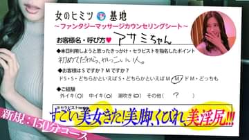 秘●基●ファンタジーマッサージ カウンセリングシート■女性用風俗を知ったきっかけHPを見て・X(旧Twitter)■女性用風俗のご利用について初めて利用■本日利用しようと思ったきっかけ、セラピストを指名したポイントはじめてだから、かっこいい人。■施術配分お任せ■アロママッサージで重点的に施術を受けたい部分腰・太もも・ふくらはぎ・足■アロマオイルの香りホワイトサボン■性感マッサージでしたい希望プレイキス・ハグ・全身リップ■ご経験外イキ(〇)・中イキ(〇)・潮吹き(〇)・その他(×)■お客様はSですか?Mですか?M■お客様からセラピストへのボディータッチなどハグ■照明のお好み程よく■ミュージックヒーリング系■本日のご希望コース150分■オプション電マ【禁止事項】当店ではいかなる理由があっても、本番行為を禁止しております。セラピストに対する本番行為の要望や、本番行為を促す言動も一切認めておりません。